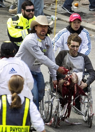 以下、ザウルスでござる様が和訳し紹介したブログより引用させて頂きます。 ーーー引用開始 ボストンテロ負傷者たちは“役者”だった! ステージブラッド“演出用血液”も使われていた! オレゴン州の救急医療技士のコメント わたしはオレゴン州で救急医療技士の資格で仕事をしています。重度の大動脈出血、内出血、死亡、心肺停止といったケースをさんざん見てきています。こうした凄惨な現場での職業的経験から以下のコメントをします。 写真A 爆弾などで両足を失うと、大腿動脈からの出血のため1分で体内の血液は半分になります。2分後には死亡します。鋭利でない破片による損傷の場合の出血はさらにひどくなります。肉が切られるのではなく裂かれるために、動脈も脈管組織もさらに露出することになるからです。人間の体には5リットルから6リットルの血液があります。鋭利でない破片を浴びるようなかたちで両足を失うようなことが実際にあれば、血の海になります。その負傷者はそこで全身血まみれになるはずです。さらに負傷個所の動脈からの血液の噴出が見られるはずです。その負傷者は血の気が引き蒼白になって嘔吐し、朦朧として気を失います。 写真に見られる止血処置ですが、縛られてもいませんし、帽子の男が上から吊り下げているだけです。これでは動脈裂傷には何の役にも立ちません。そもそも写真の人物の右足には何の止血処置もありません。そして一滴の血液も垂れていません。地面をよく見てください。これはあり得ないことです。顔と手の色は血液の循環を示しています。両足を失った人間の血色ではありません。 これは“役者”です。これは“演出”です。この“でっち上げ”の手口を説明いたします。 フレーム6: この両足を吹き飛ばされたはずの男は左端にいます。地面に横たわって後頭部を起こしているのが見えます。この男は元々膝から下がありません。彼の足元にフードをかぶった男がいます。この男が“黒子”です。吹き飛ばされ膝から下の骨の残骸をつける作業をしています。黒人の女性がその作業の目隠し役をしています。 フレーム8: 演出用の“骨露出部分”を装着しました。爆発の数秒後というこれだけの大混乱のさなかにありながら、このフードをかぶった男はおもむろにサングラスを取り出してかけます。これはシグナルであるとともに、すでにかぶっているフードと同様、このあとに予定されている写真撮影に備えて身元が割れないようにしているのです。 フレーム9: サングラスをかけ、“黒子”の男は女性と目配せをして、次の動作の息を合わせます。 フレーム11: “黒子”の合図を受け、女性が今度は前方のカメラの方に向かって“骨露出部分”の装着完了を知らせます。“主役”の“両足吹き飛ばされ男”は女性の肩越しに左脚の“骨露出部分”を高く上げます。出血はありません。奇妙にも脚には血がついていません。本当でしたら血液の噴出があって脚も骨も女性も血みどろです。なぜか女性のブラウスは純白のままです。 フレーム14: 阿鼻叫喚の中でこのフードの黒子と黒人女性だけは冷静に見えます。二人は主役の“両足吹き飛ばされ男”を演出する重要な任務を負っているからです。フードの黒子の右手は女性の後ろで演出用血液を撒くのにいそしんでいます。“主役”は今や“先を吹き飛ばされた脚”を高々と掲げています。しかし、外科学的常識に反して彼の両脚にはほとんど血がついていなく、さらりとしています。 フレーム20: ステージブラッド(演出用血液)の撒布と“骨露出部分”の装着が完了したことを、“主役”は開いた手を掲げてカメラに合図しています。女性もいっしょに同じ合図をしています。この段階でも、“主役”の両脚からは出血の様子がまったく見られません。両足を吹き飛ばされれば、血の海に横たわっているはずですが、この“主役”の両手にはまったく血がついていなく、きれいなままです。 このひとたちは“役者”です。これは“演出”です。これはテロの残虐さを強調し印象づけるための作りものの芝居です。 さらに以下のたまたま撮られた写真をごらんください。 写真B: 最初の爆発後の光景です。ここには“被害演出”の明らかな証拠が見られます。野球帽に赤いジャンパーの“監督”が白いTシャツの男に指示をしています。後ろには例のフードの“黒子”が横になったまま指示を聞いています。決してフードとサングラスを取ろうとしません。身元が割れるのを恐れています。“監督”白いTシャツ男も申し合わせたようにサングラスです。彼のそばにはすでにおなじみの目隠し役の黒人女性が横たわっています。 しかし、肝心の“主役”の“両足吹き飛ばされ男”の姿が見えません。たまたまちょうど黒人女性の裏に隠れるかたちになっているのでしょうか。もしそうならば、両足を吹き飛ばされて転がっている“瀕死の人間の姿”が彼女の後ろを通り過ぎる男性の目にとまらないわけがありません
